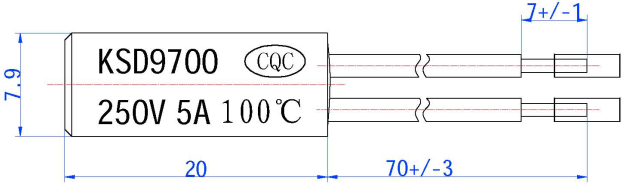 Model KSD9700Bimetal Thermal Protector is composed of high sensitive disk-shaped bimetallic element,moveable contact,static contact plate, fixed baseplate, moveable spring plate, case and temperature resistance lead wire.The bimetallic strip is fixed on the baseplate, which can maintain the consistency of disconnection and reset temperature after long-term use. Its main working principle is to control the temperature by opening or closing the bi-metal strip. It stays at normally closed/normally open status, it opens/closes when temeprature rising and closes/opens when temperature decreasing.It protects the device overheating and burning out. At normal temperature, the moveable contact and the static contact are in the closed state, the circuit is on.When the use of electrical failure, the temperature rise to the rated disconnect temperature value of the product, the bimetal element heat produced internal stress rapid action, it push the contact and cut off the power supply, then the electrical appliances stop working, so as to play a protective role.When the temperature of the protected appliance drops to the safe temperature, switch on the power again and the appliance resumes working.